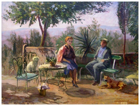 GIULIO GHELARDUCCI Livorno 1883 – Firenze 1970 Il Sig. Corrado e la Signora Assunta Carapelli alla Fattoria del Villino a Lucignano 1954 Olio su tavola 60 x 80. Firma e data in b. a d.; sul verso titolo, firma e data. B.A.: 190