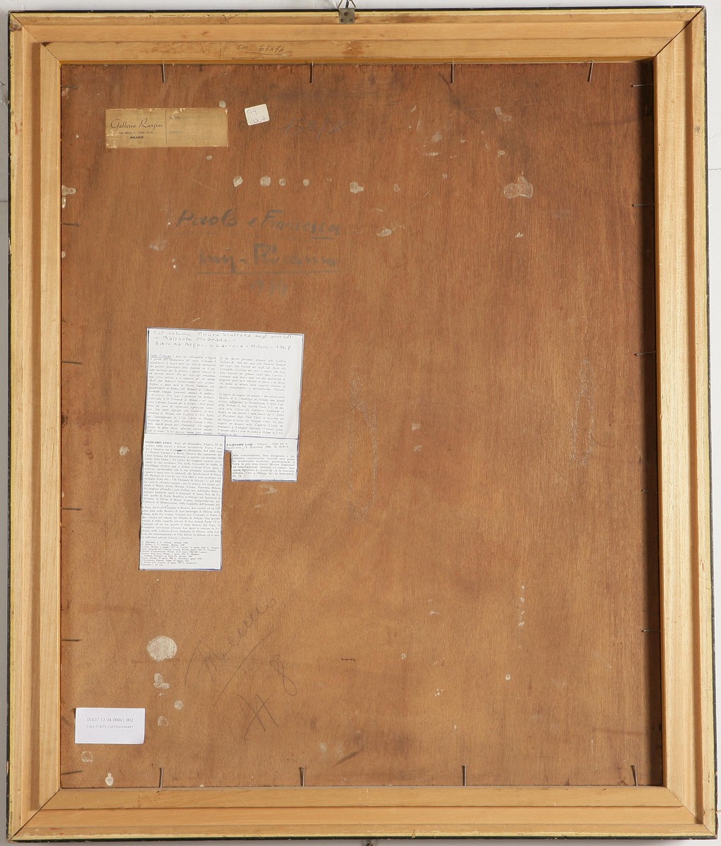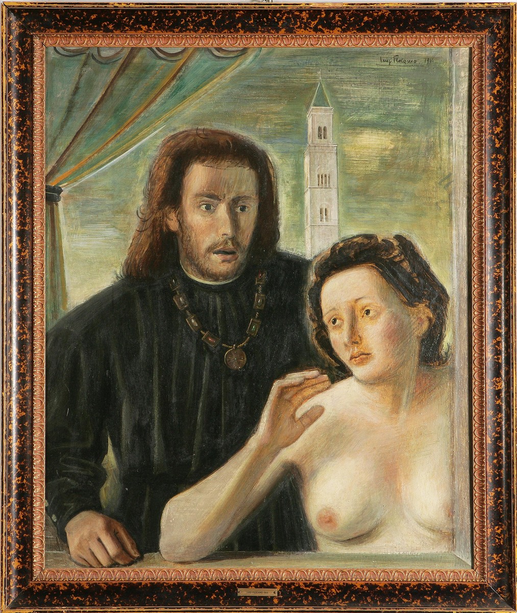 FILOCAMO LUIGI (1906 - 1988) I Malatesta. 1944 Olio su tavola, cm 61x75. Opera pubblicata nel catalogo "Luigi Filocamo" a cura di Giorgio Nicodemi, ed. Casa d'Arte Ariel Milano. Firma e anno in alto a destra. Al retro cartiglio descrittivo della Galleria Ranzini di Milano. Cornice presente.