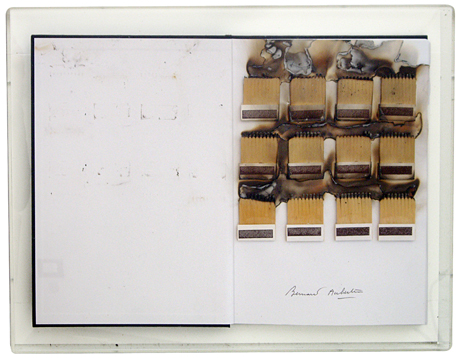 BERNARD AUBERTIN Fontenay aux Roses (Francia) 1934 – Reutlingen (Germania) 2015 Il Fuoco e il Rosso (Libro bruciato) 2010 Bruciatura di scatole di fiammiferi su libro dell’autore 31 x 45 titolato “Il Fuoco e il Rosso / Dai tableaux clous ai tableaux brutalisées” a cura della galleria Rosenberg, Milano. Firma in b. a d. Certificato di autenticità ArteTivù, Marcon. L’opera è corredata di foto all’autore mentre la firma. B.A.: 700