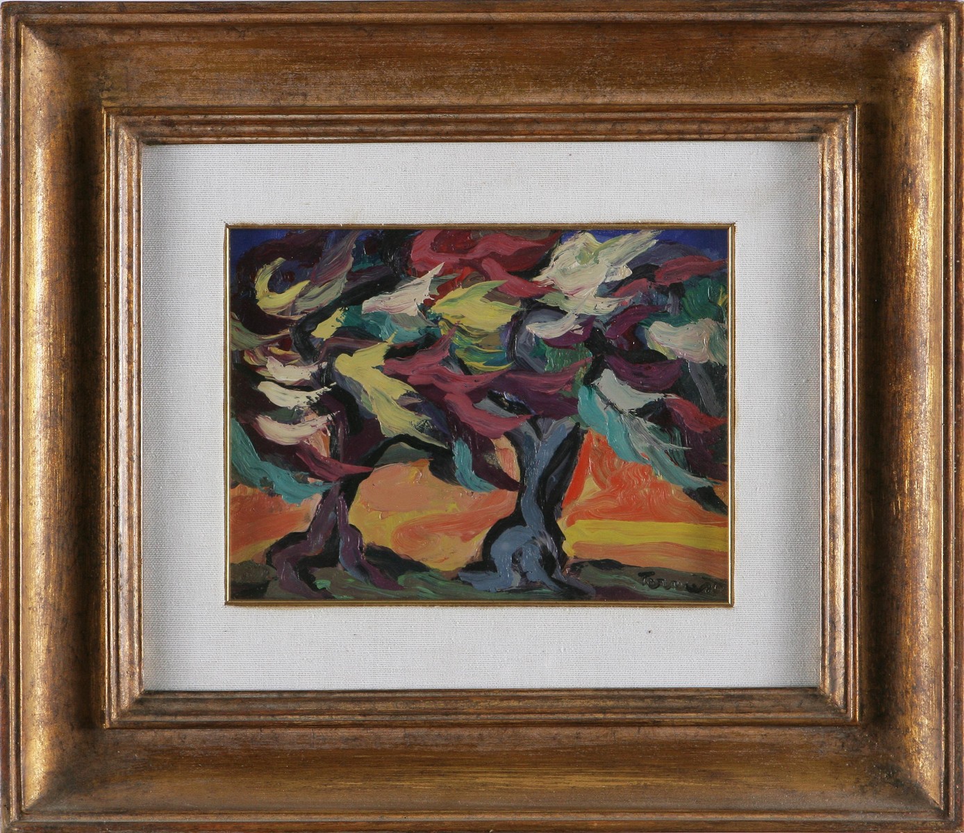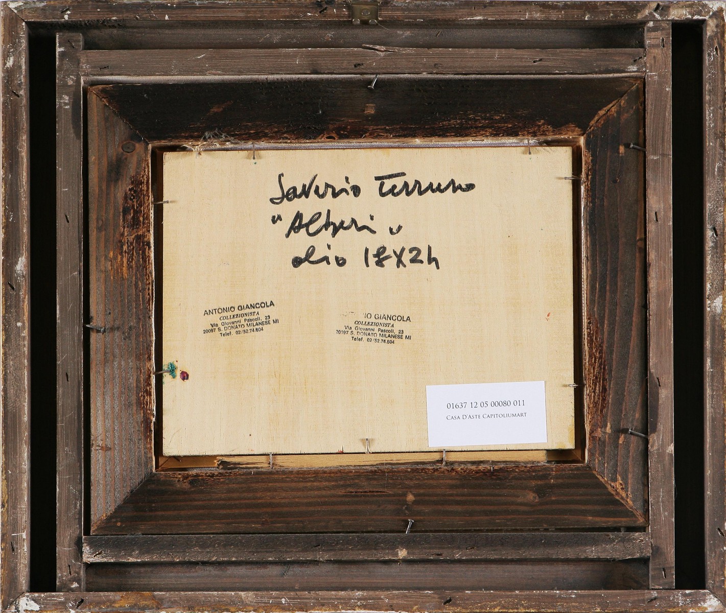 TERRUSO SAVERIO (1939 - 2003) Alberi. Olio su tavola, cm 24x18. Firma in basso a destra. Al retro firma, titolo e dimensioni. Timbro " Antonio Giancola collezionista". Cornice presente.