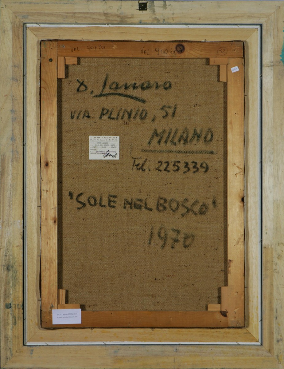 LANARO DINO (1908 - 1998) Sole nel bosco. 1970 Olio su tela, cm 50x70. Firma e anno in basso a destra. Al retro firma, titolo e anno. Cartiglio della Galleria Annunciata, Milano. Cornice presente.