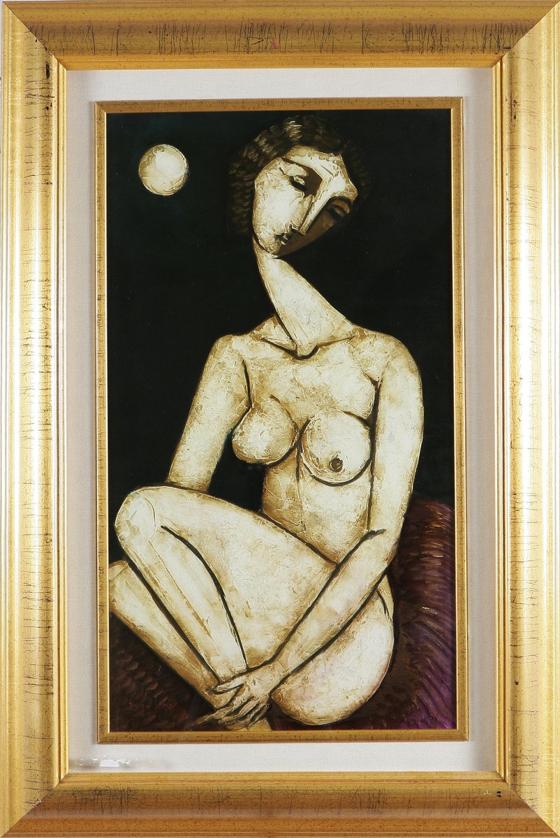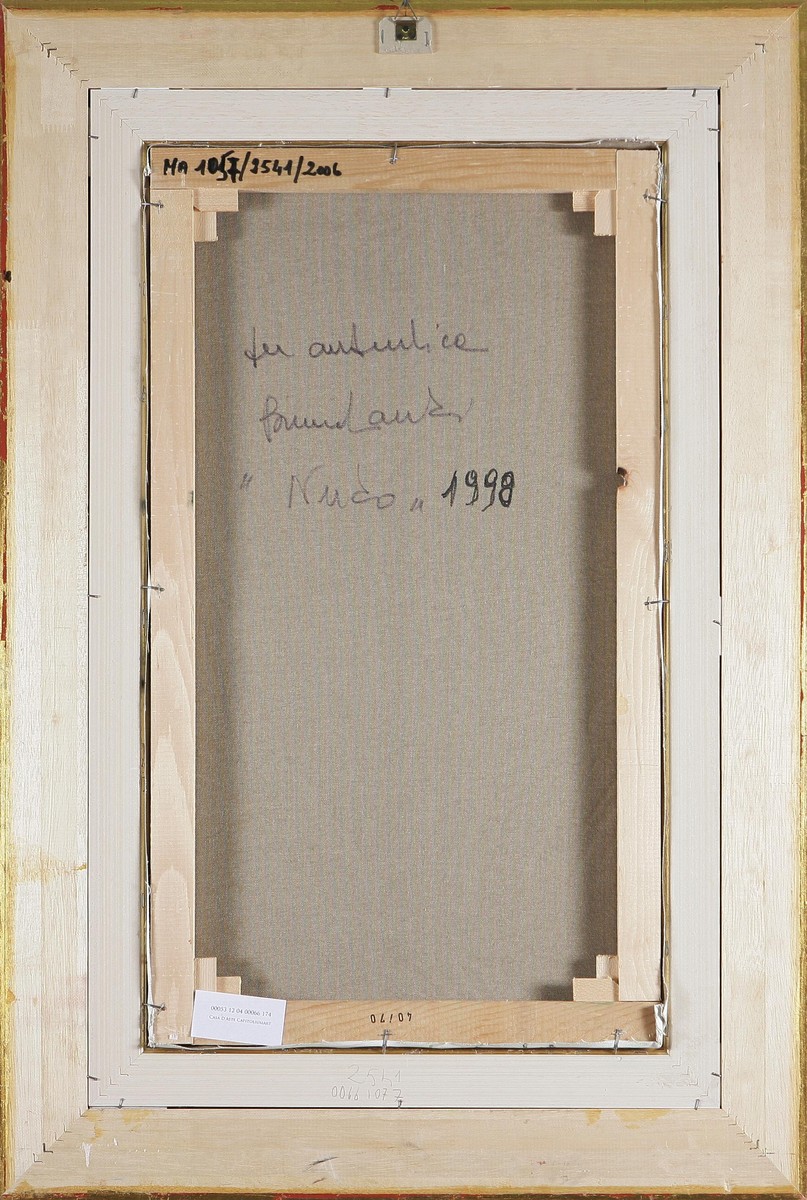 LANDI BRUNO (n. 1941) Nudo. 1998 Olio su tela, cm 40x70. Opera archiviata presso l'Archivio Nordest, Seregno, come da documentazione fotografica allegata riportante relativo n. d'inventario. Firmato in basso a sinistra. Al retro firma e titolo. Cornice presente.