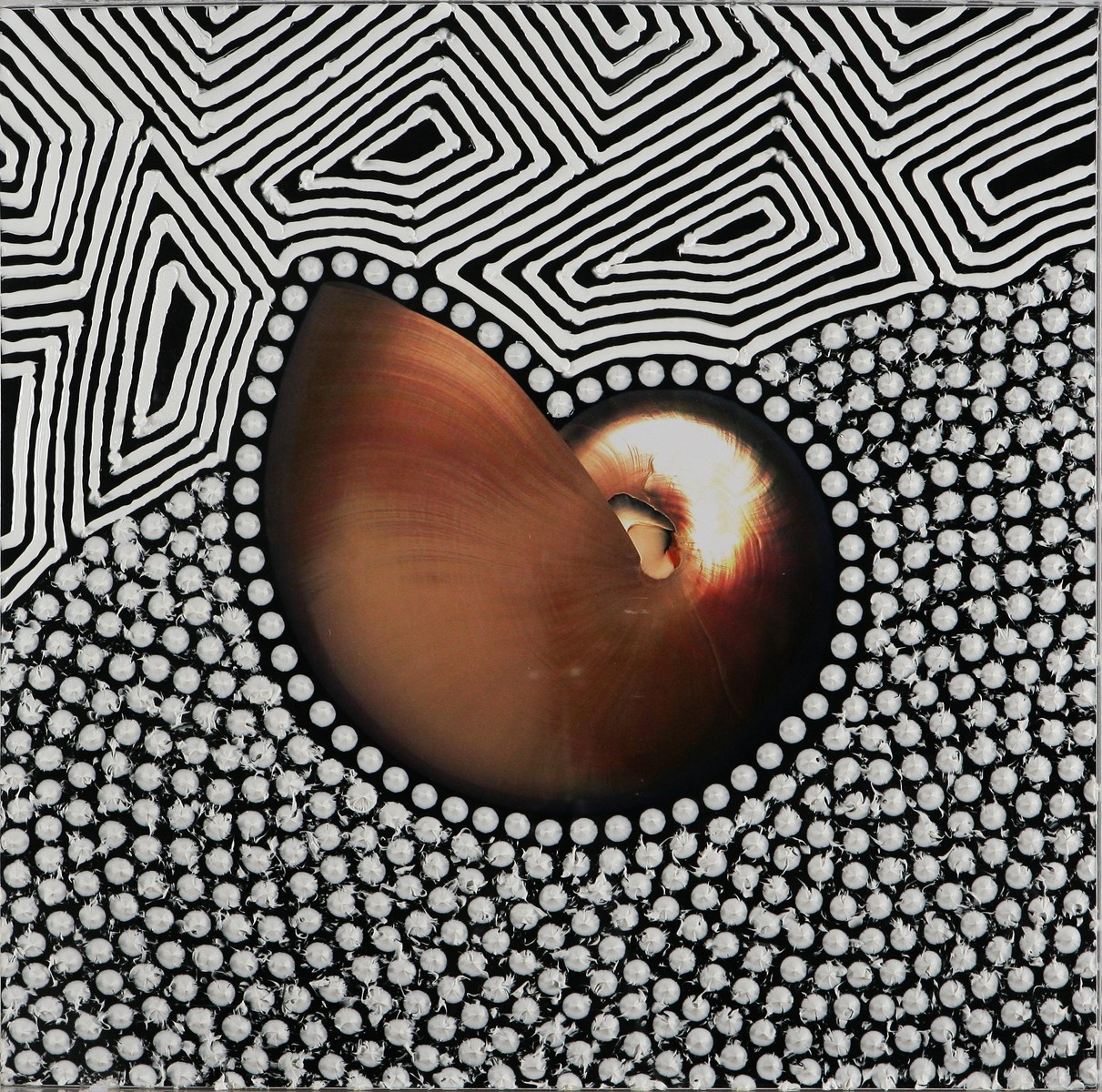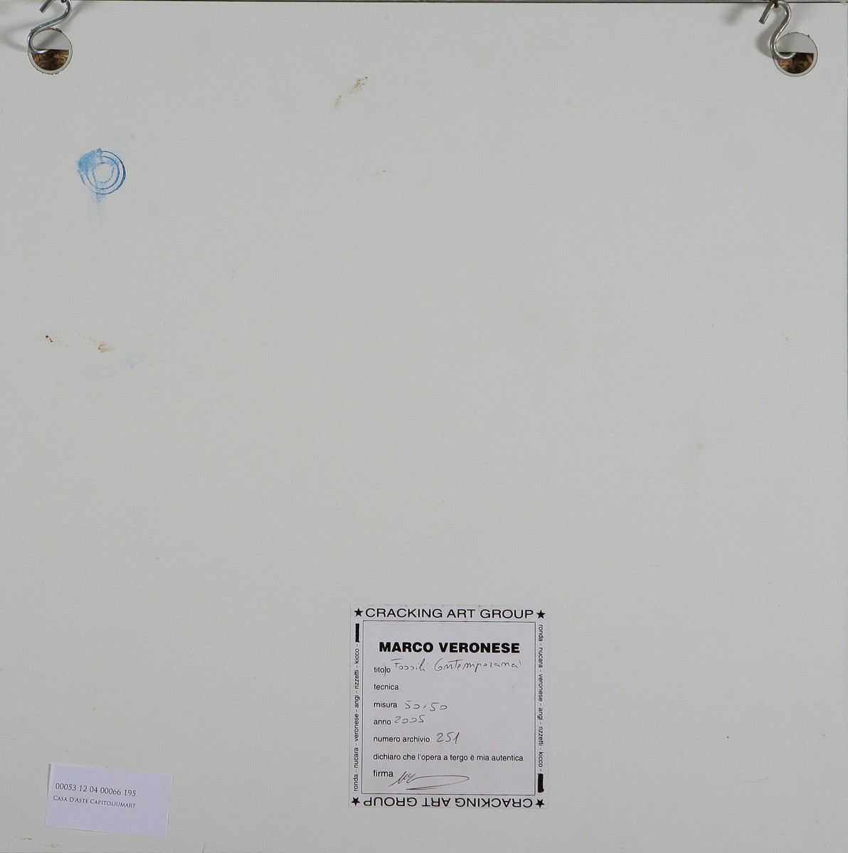 VERONESE MARCO (n. 1962) Fossili contemporanei. 2005 Tecnica mista su tavola, cm 50x50x4. Autentica dell'artista su fotografia. Firma al retro. Al retro titolo, firma, anno, archivio dell'artista ed etichetta Cracking Art Group.