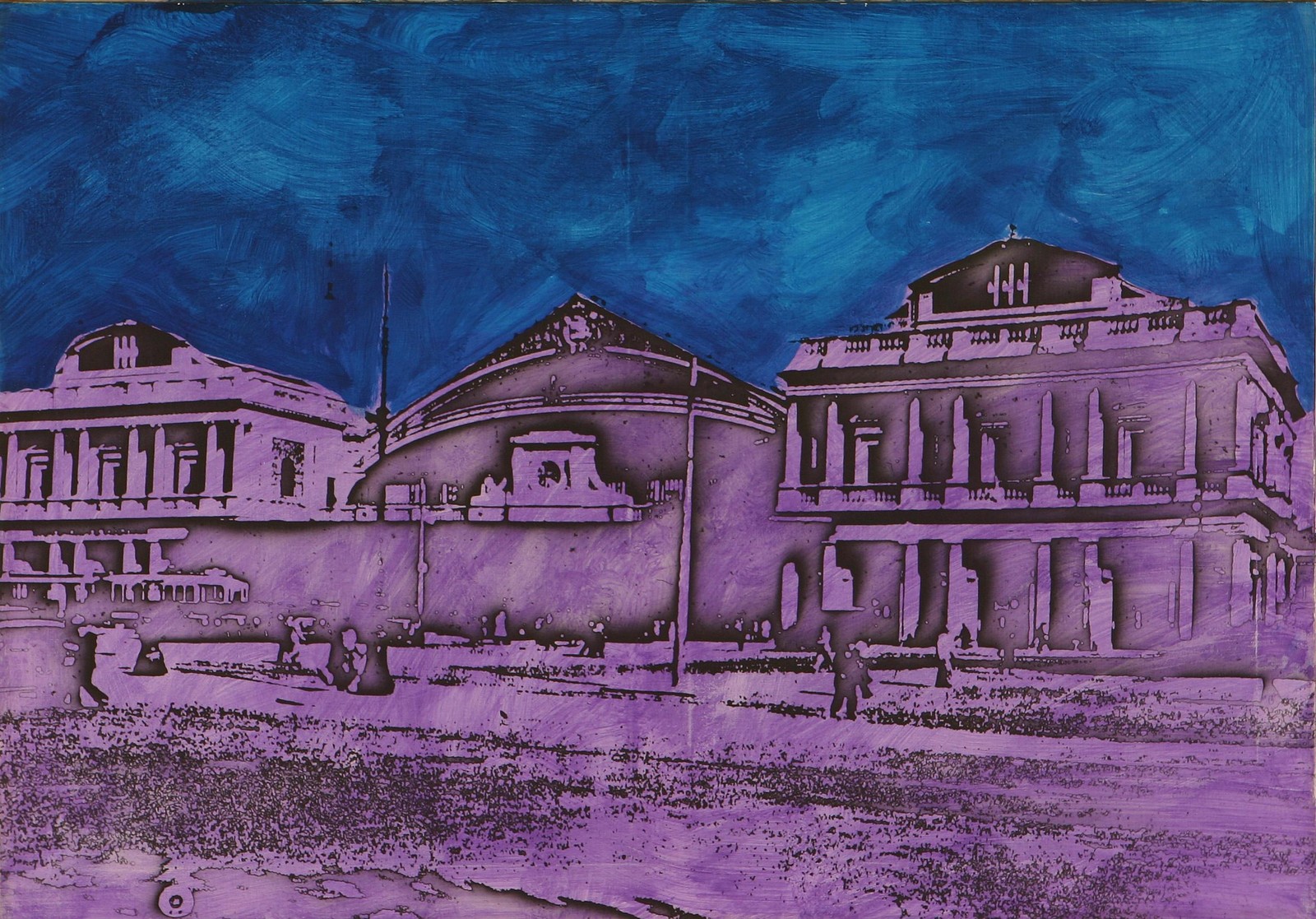 FESTA TANO (1938 - 1988) Piazza d'Italia. smalti su tela emulsionata, cm 100x70. Opera archiviata presso l' Archivio Tano Festa a cura dello Studio Soligo, Roma, come da documentazione fotografica allegata riportante relativo n. d'inventario. Anni '80. Cornice presente.