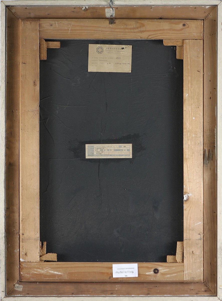 DEL PEZZO LUCIO (n. 1933) Emergente. 1962 Collage su tavola, cm 50x73. Opera archiviata presso l'archivio Lucio Del Pezzo a cura della Galleria Vinciana, Milano, come da documentazione fotografica allegata riportante relativo n. d'inventario e la firma dell'artista. Firma in basso a destra. Cartiglio Galleria Sebastiani, Milano, e della Galleria Schwarz, Milano. Cornice presente.