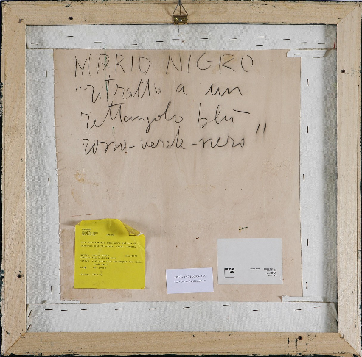 NIGRO MARIO (1917 - 1992) Ritratto ad un rettangolo blu, rosso, verde, nero. 1989 Acrilico su tela applicata su tavola, cm 50x50. Al retro firma, titolo e cartiglio Arte Struktura, Milano. Cornice presente.