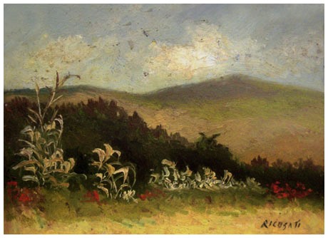 SIRIO RICUSATI Livorno 1916 – Ardenza 1992 Paesaggio – Primavera, Ardenza 1984 Olio su faesite 15 x 20. Firma in b. a d.; sul verso titolo, firma, data e località + etichetta parzialmente leggibile. B.A.: 50
