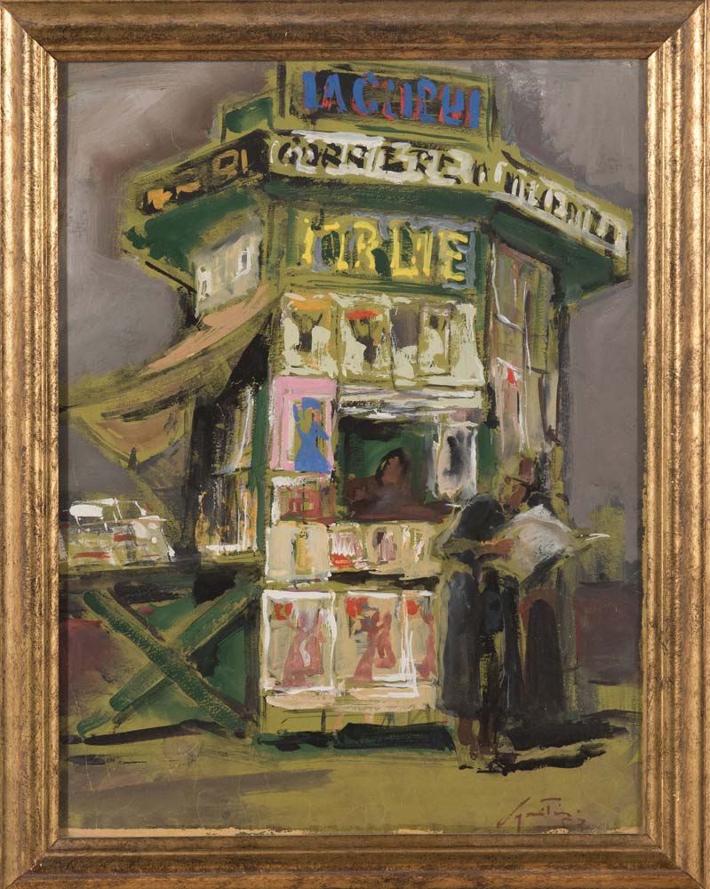 Italo Squitieri (Potenza 1907 – Cortina d'Ampezzo 1994), “Chiosco dei giornali”, 1953. Olio e tecnica mista su cartone, firmato e datato in basso a destra Squitieri 53, H cm 43x32.5
