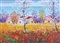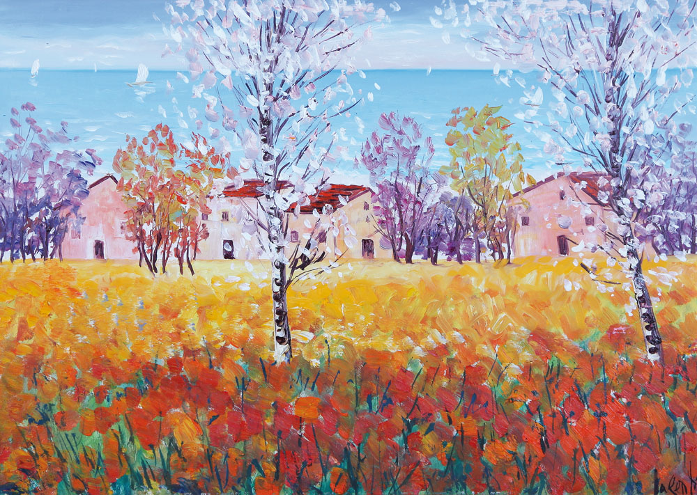 ANTONIO IALENTI Campobasso 12/07/1937 - Campo di fiori con marina ligure, olio su tela cm. 50x70, firma in basso a destra, titolo e firma al retro, dichiarazione d'autenticità dell'artista su foto.