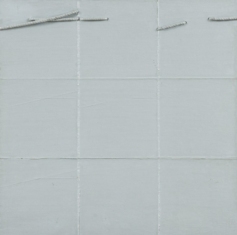 Giovanni Campus (Olbia 1929) Interrelazionale continuo - Progetto opera, 1980 Cartone, corda e acrilico su tavola, cm. 30x30 Sul verso: firma, data, titolo e descrizione.