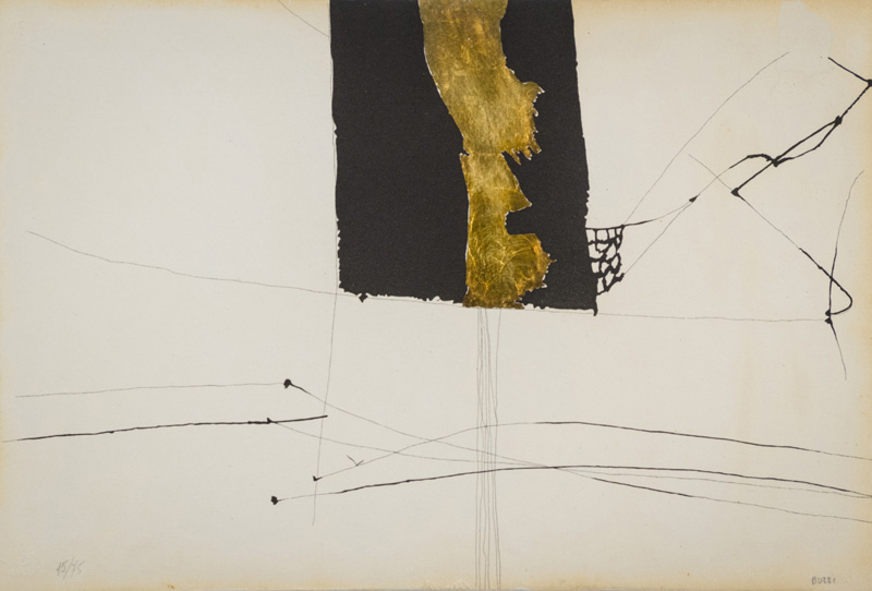 Alberto Burri (Città di Castello (Pg) 1915 Nizza 1995) Variazioni, 1962 Acquaforte, acquatinta e collage con foglia d'oro, su cartoncino, cm. 26x40, es. 15/75. Firma in basso a destra, tiratura e timbro a secco "Stamperia 2RC" in basso a sinistra. Sul verso: "Etichetta Galleria Flori", Firenze, Montecatini, con timbro e descrizione. L'opera è pubblicata sulla copertina del Libro "Variazioni" di Emilio Villa. Certificato di Autenticità della Fondazione Albizzini Collezione Burri, Città di Castello (Perugia), dove è descritta l'opera e la relativa pubblicazione.