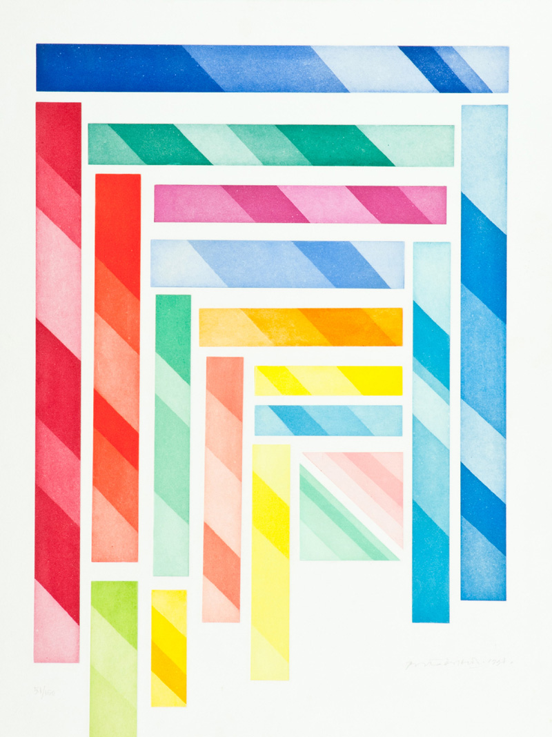 Piero Dorazio (Roma 1927 2005) La Grecia, 1997 Acquaforte e acquatinta su carta di cm. 76x58, es. 51/150 Firma e data in basso a destra, tiratura e timbro a secco "Grafica d'Arte Lombardi", Roma, in basso a sinistra. Sul verso: timbro di Garanzia "Grafica d'Arte Lombardi", Roma, con descrizione.