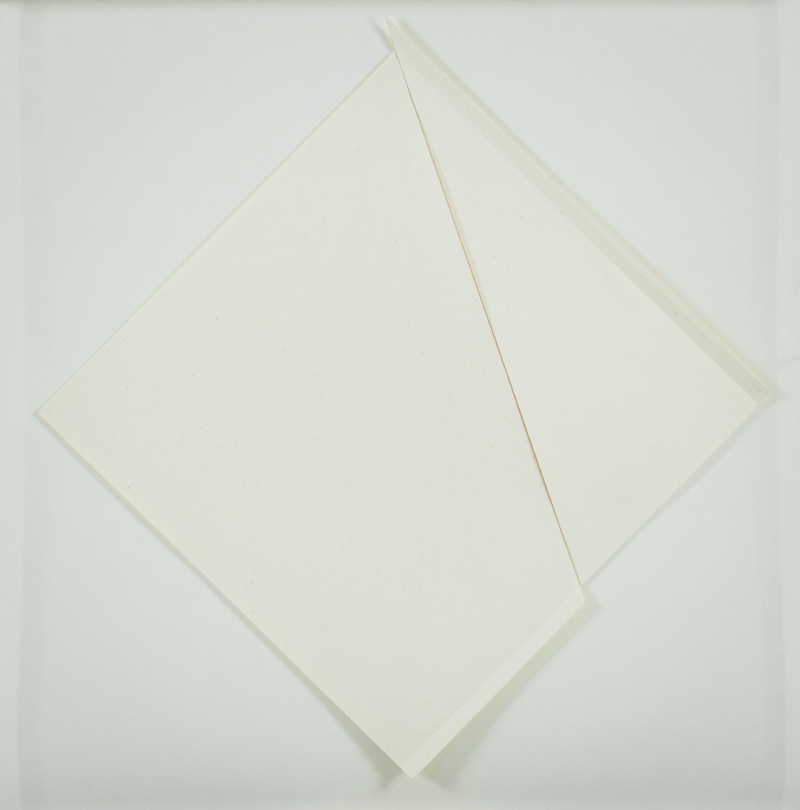 Sandro De Alexandris (Torino 1939) Misura di spazio e riverberazione cromatica, 1970 Collage di cartoni bianchi su cartone, cm. 50x50,in teca di plexiglas. Sul verso: firma, data e titolo.