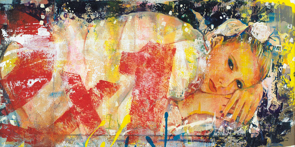 MAURIZIO DELVECCHIO Basilea (Svizzera) 22/05/1962 - Due per uno, 2004, olio e tecnica mista su tela cm. 40x80, firma in basso a sinistra, titolo, firma, anno e tecnica al retro, dichiarazione d'autenticità dell'artista su foto.