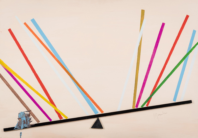Aldo Mondino (Torino 1938 2005) Bilancia, 1970 Tecnica mista su tela, cm. 70x100. Firma in basso a destra. Autentica dell'Archivio Aldo Mondino con timbro a secco e firma "Antonio Mondino" e Archivio n° 20090221110954.