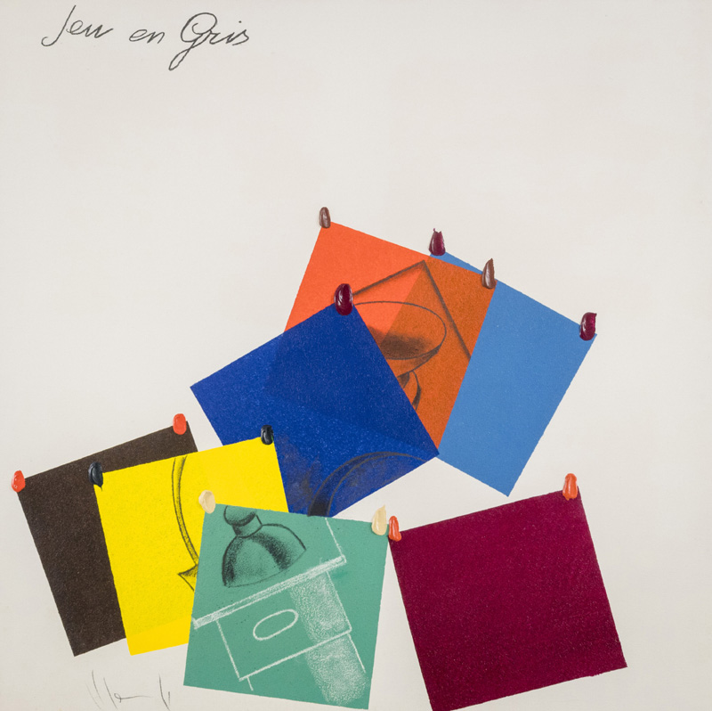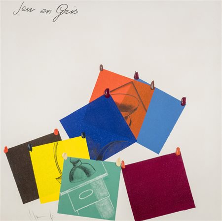 Aldo Mondino (Torino 1938 2005) Jeu en Gris, Olio e acrilico su tela, cm. 80x80. Firma in basso a sinistra, titolo in alto a sinistra. Sul verso: Etichetta "Città Finale Ligure Turismo e Cultura". Autentica dell'Archivio Aldo Mondino con timbro a secco e firma "Antonio Mondino" e Archivio.