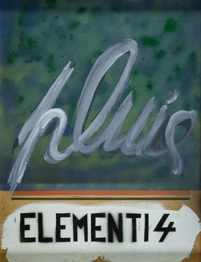Julien Blaine (Rognac 1942) Elementi, 1991 Tecnica mista su tavola, cm. 77x60. Titolo in basso al centro. Sul verso: firma e data.