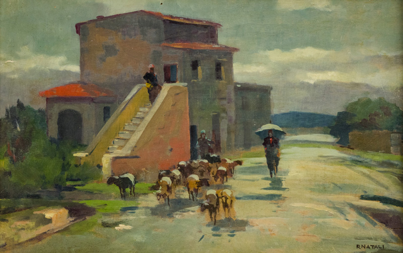 Renato Natali (Livorno 1883 1979) Ritorno all'ovile Olio su tavola, cm. 34,5x54,5. Firmato in basso a destra.