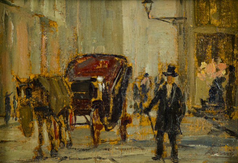 Giovanni Lomi (Livorno 1889 Livorno 1969) Fiaccheraio fiorentino 1920 c.a. Olio su tavola, cm. 13,5x19,5 Firmato in basso a destra. Autentica di Massimo Lomi su foto con Archivio n° 419.