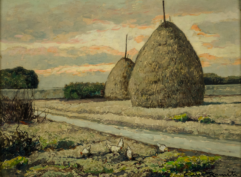 Gino Romiti (Livorno 1881 1967) Pagliai Olio su faesite, cm. 30x40. Firmato in basso a destra.