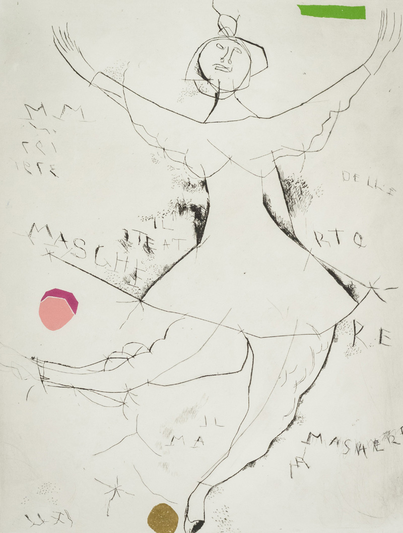 Marino Marini (Pistoia 1901 Viareggio 1980) Danza minima I Acquaforte puntasecca e acquatinta a colori, cm. 64,4x49,1, su carta di cm. 100x70, es. 37/50. Firma e timbro a secco "Il Cigno Stamperia d'Arte", Roma, in basso a destra, tiratura in basso a sinistra. Bibliografia: Giorgio e Guido Guastalla "Marino Marini- Catalogo ragionato dell'Opera grafica (Incisioni e Litografie) 1919-1980, edizioni Graphis Arte, pag. , tav. 171.