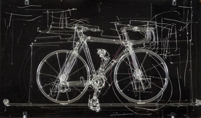 Mahatma Marchi (Varese 1972) Bicicletta Scultura in vetro soffiato applicata su pannello di metallo in teca di plexiglas, cm. 34x56x12.