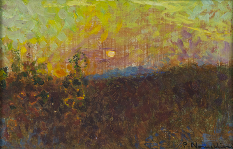 Plinio Nomellini (Livorno 1866 Firenze 1943) Paesaggio in Versilia 1910/1915 Olio su tavola, cm. 23x35,5 Firmato in basso a destra. Autentica di Eleonora Barbara Nomellini, su foto.