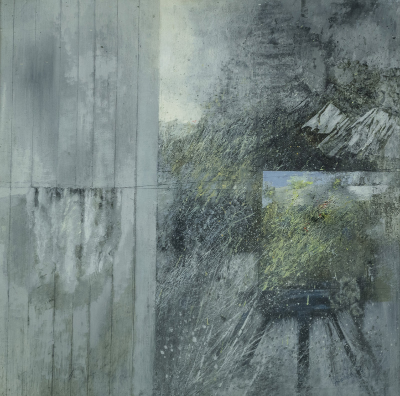 Giuseppe Banchieri (Milano 1927 Poveromo (Ms) 1994) Quadro nel cortile 1966 Olio su tela, cm. 60x60. Firma e data in basso a destra. Sul verso: firma, data e titolo.
