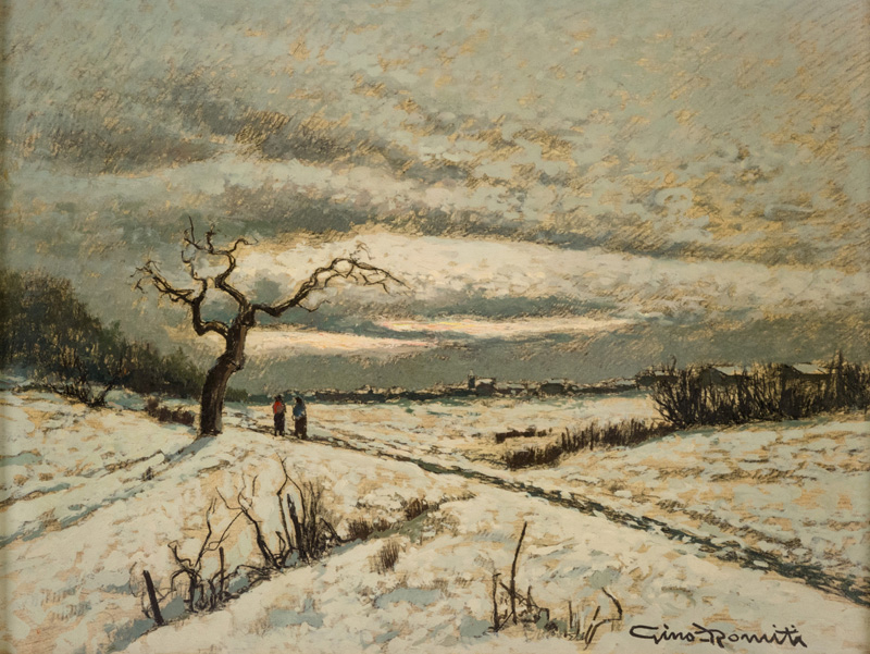 Gino Romiti (Livorno 1881 1967) Nevicata 1950 c.a. Olio su faesite, cm....