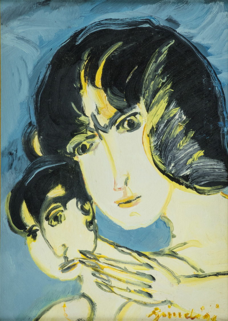 Remo Brindisi (Roma 1918 Lido di Spina (Fe) 1996) Maternità anni '90 Olio su tela, cm. 35x25. Firmato in basso a destra. Sul verso: Scritto di Autenticità dell'Artista. Autentica dell'Archivio generale " Remo Brindisi - Galleria Pace", Milano, con n° A1362.
