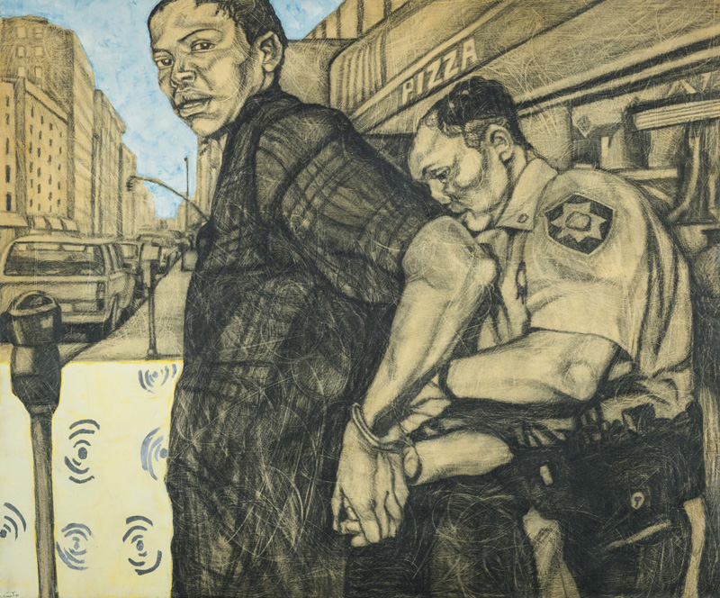 Luca Zampetti (Camerino 1966) Lo arrestarono a Little Italy 2001 Grafite ed encausto su tavola, cm. 75x90x8. Firma e data in basso a sinistra. Sul verso: Etichetta e timbro dell'Artista con firma e descrizione.