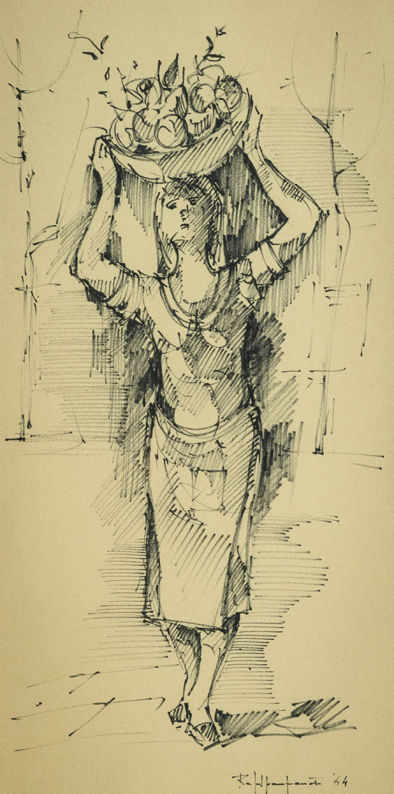 Raffaella Spampanato (Lucca 1935) Figura con cesto di frutta 1964 Pennarello su carta, cm. 46x23. Firma e data in basso a destra.