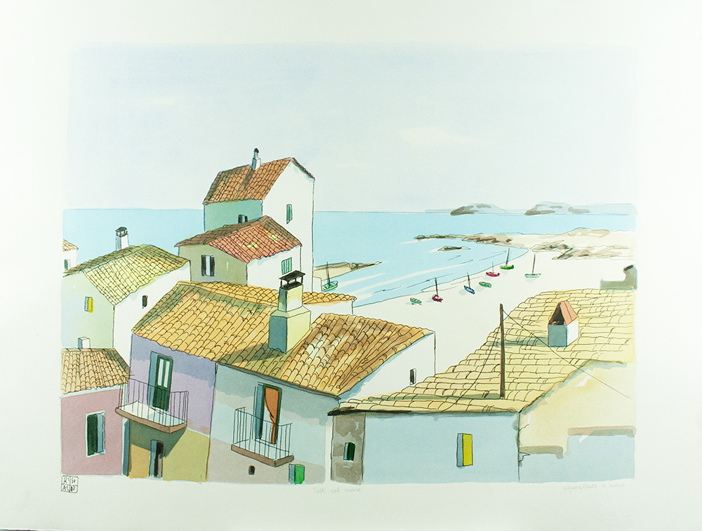 ALDO RISO S. Maria di Leuca 1928 - Roma 2008 "Tetti sul mare " serigrafia acquerellata a mano firmata in basso a sx cm 60x80 timbro a secco Incisione Stamperia d' Arte + timbro a secco dell' Artista al retro certificato Grafica Lombardi
