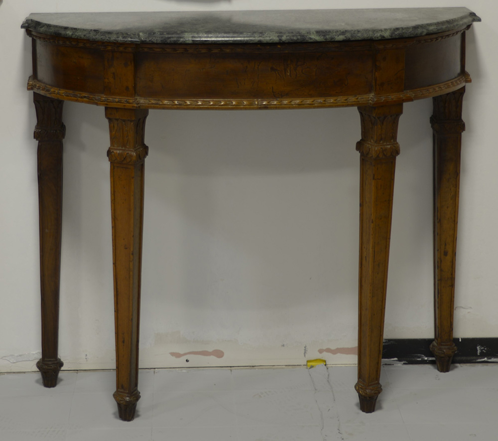 Console a mezzaluna con profili della fascia intagliati a motivo vegetale ripetuto, gambe rastremate decorate a foglie all'attacco, piano in marmo. Secolo XVIII (cm 109x94x52)(piano in marmo non coevo, difetti)
