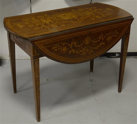 Tavolo ad alette interamente lastronato, filettato ed intarsiato con Venere e Cupido, mascheroni, motivi vegetali e fiori. Due cassettini nella fascia intarsiata a vasi con fiori, gambe rastremate. Secolo XIX (cm 103x74x52 chiuso)(difetti)