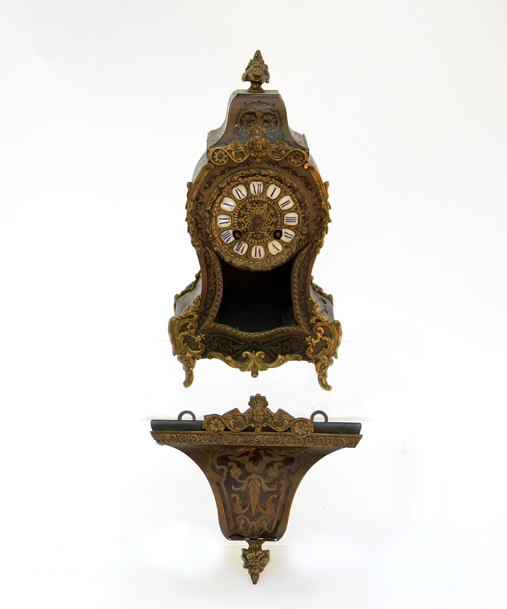 Pendola tipo Boulle di forma sagomata con applicazioni in metallo, quadrante con cartuches con numeri romani, movimento a carica settimanle con suoneria delle ore e delle mezze su campanello, scappamento ad ancora, sospensione a molla. Mensola analoga (difetti) ( h pendola cm 32 circa)