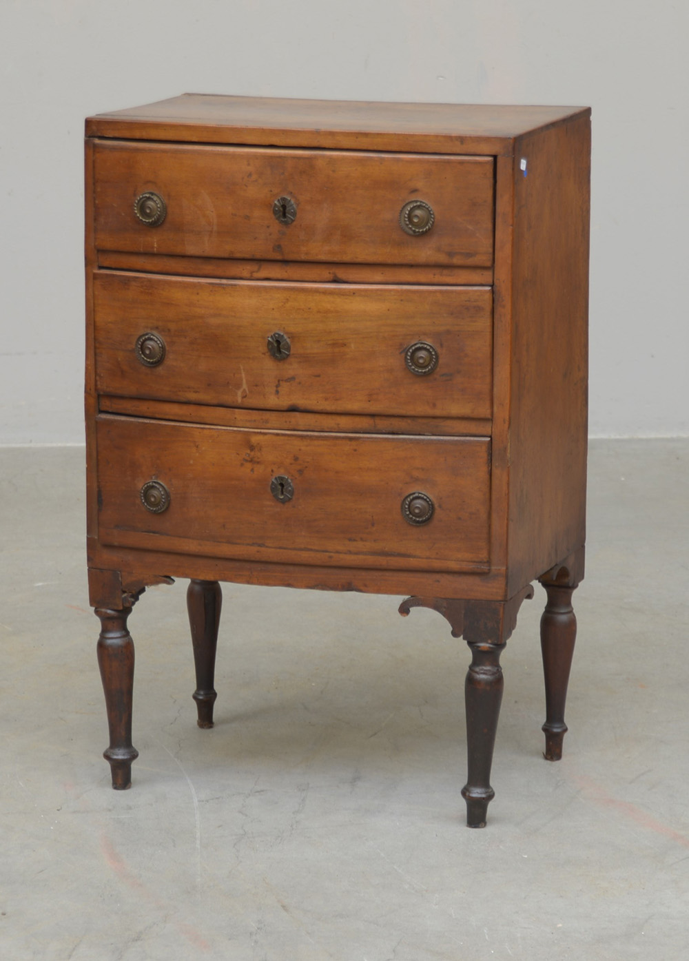 Comodino in noce a tre cassetti, fronte curvo, piedi torniti, secolo XVIII...