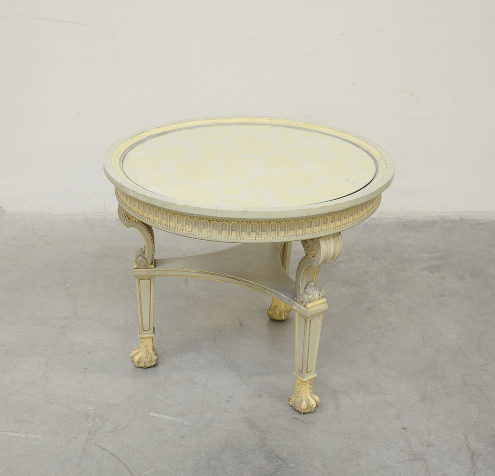 Tavolo da salotto di forma tonda in legno laccato con fascia dentellata...