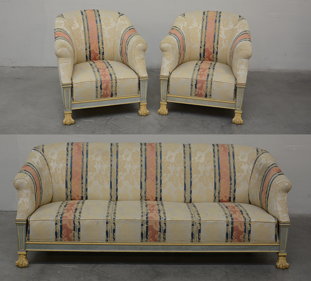 Fornitura da salotto in legno laccato composta da divano a due posti, una coppia di poltrone con piedi anteriori ferini in ghisa