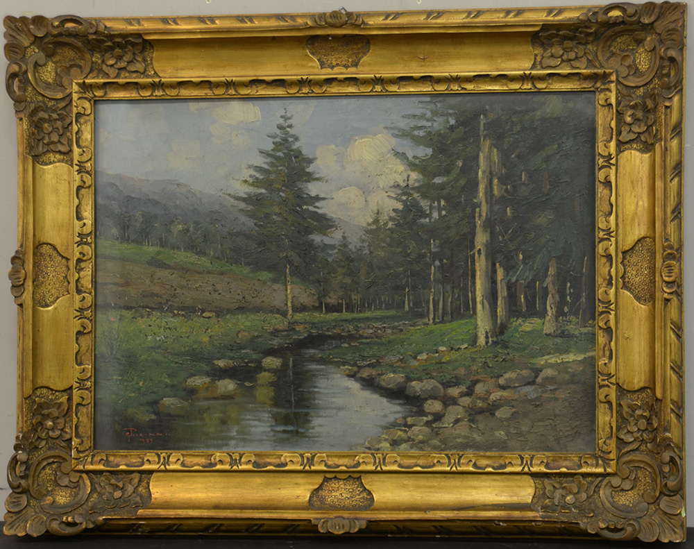 Ignoto "Paesaggio con torrente e abeti" 1953 (cm 50x70) firmato G. Piccinni e datato in basso a sinistra, in cornice (difetti)