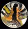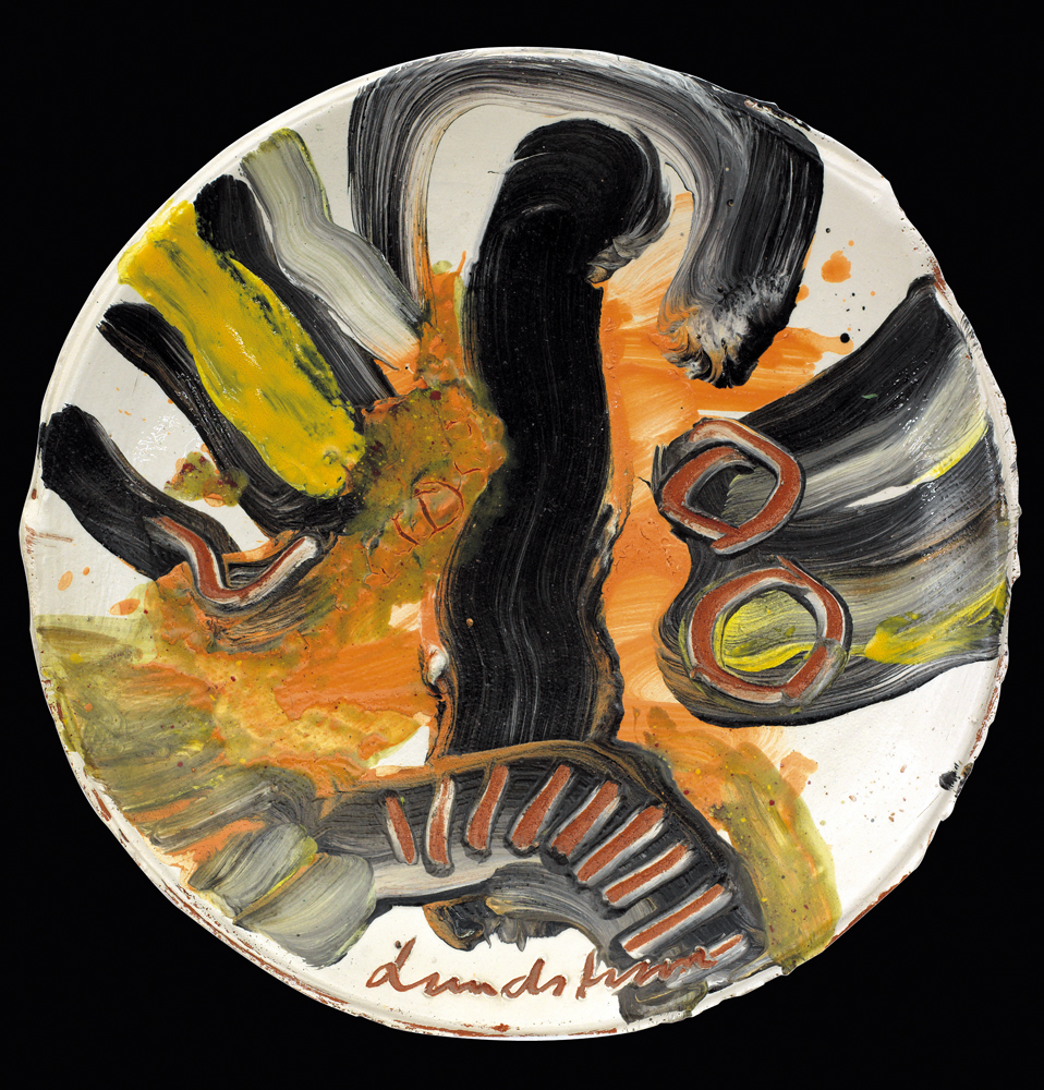 BENGT LINDSTROM Stoccolma 1925 - Njurunda 30/01/2008  Senza titolo, 1997  smalti su piatto in ceramica diametro cm. 43, firma in basso, 3 fotografie allegate ritraenti l'artista con il piatto in fase di realizzazione presso il Laboratorio di Walter Boj (Albissola).