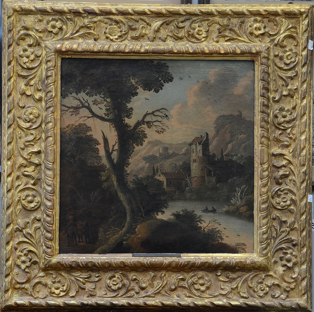 Maestro fiammingo del secolo XVII "Paesaggio fluviale" olio su tela (cm 49x49) In cornice in legno dorato