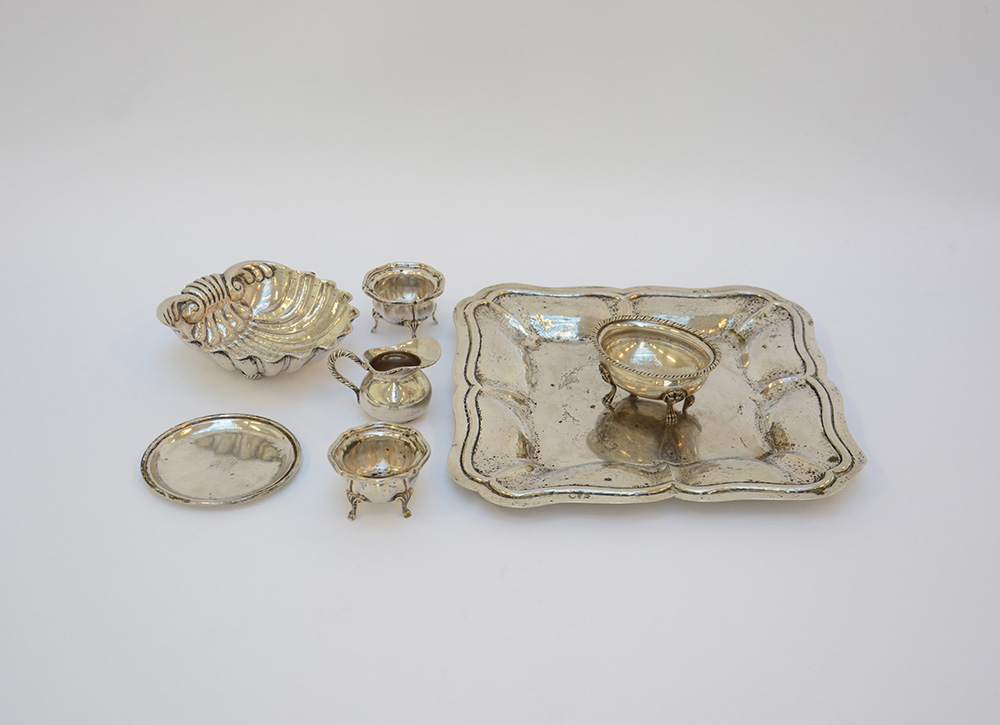 Lotto di sette oggetti in argento tra cui una conchiglia e un vassoietto quadrato e sagomato (gr 900 ca.) (difetti)