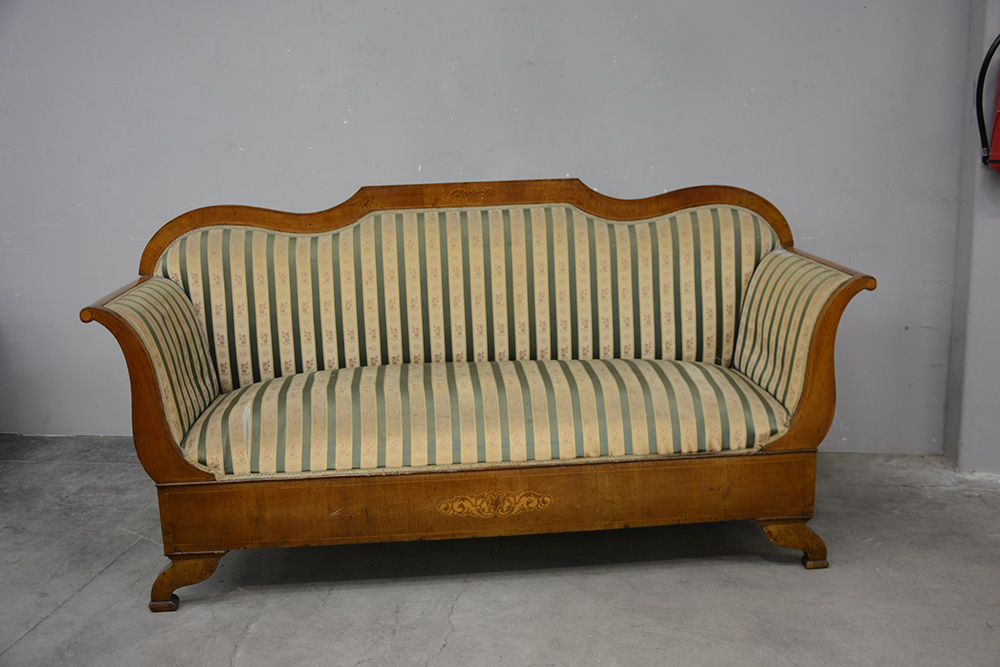 Divano con schienale e braccioli sagomati a fascia intarsiata a volute, gambe mosse. Sec. XIX