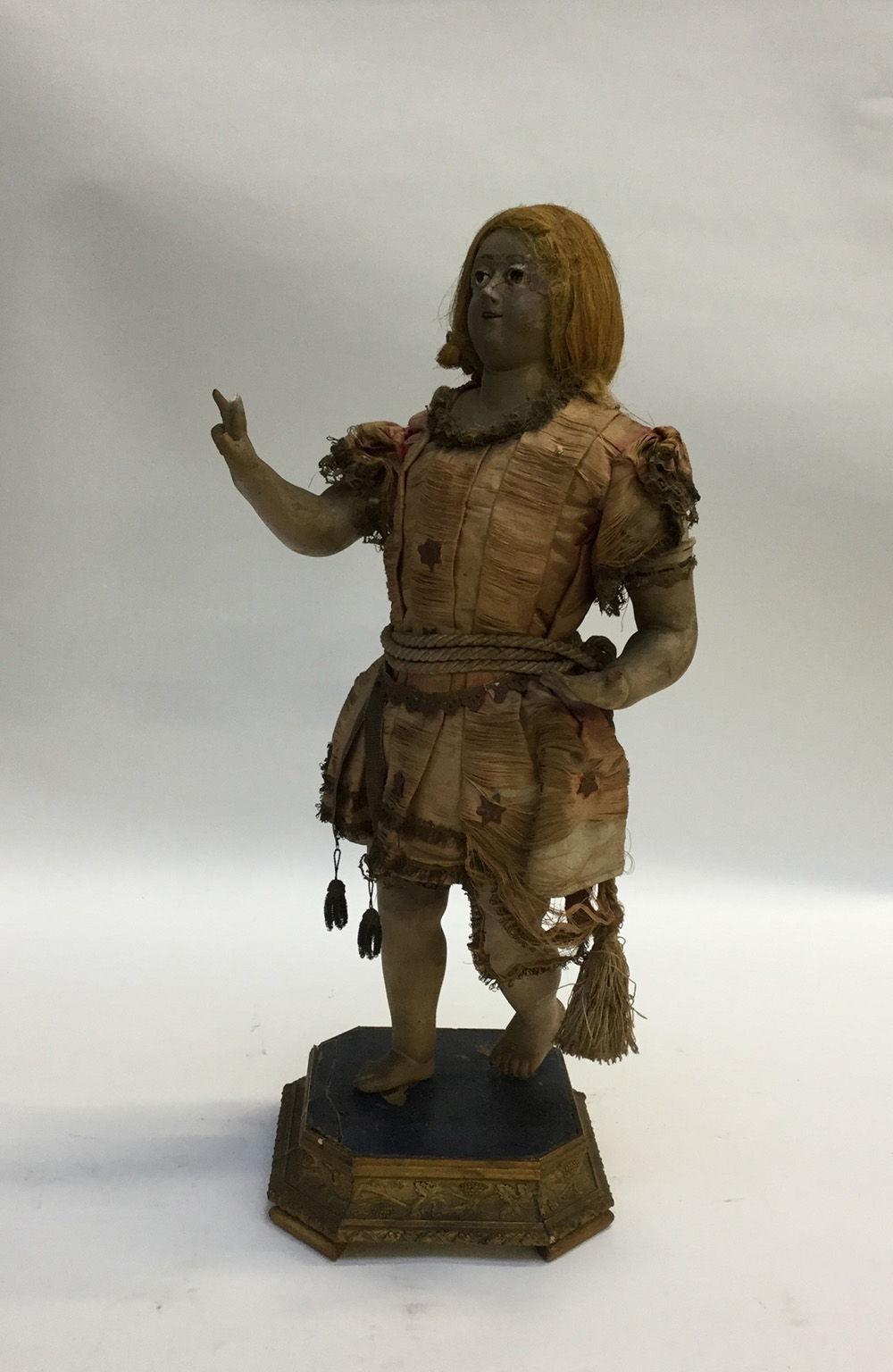 Arte popolare del secolo XIX, “Gesù bambino”, scultura in gesso dipinto con abiti in seta, cotone e piccole guarnizioni in materiali differenti; basamento in legno e pastiglia (h cm 64) (difetti e mancanze)