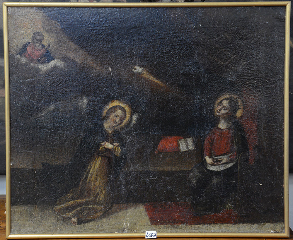 Scuola del secolo XVII "Annunciazione" olio su tela (cm 48x58) in cornice (difetti e restauri)