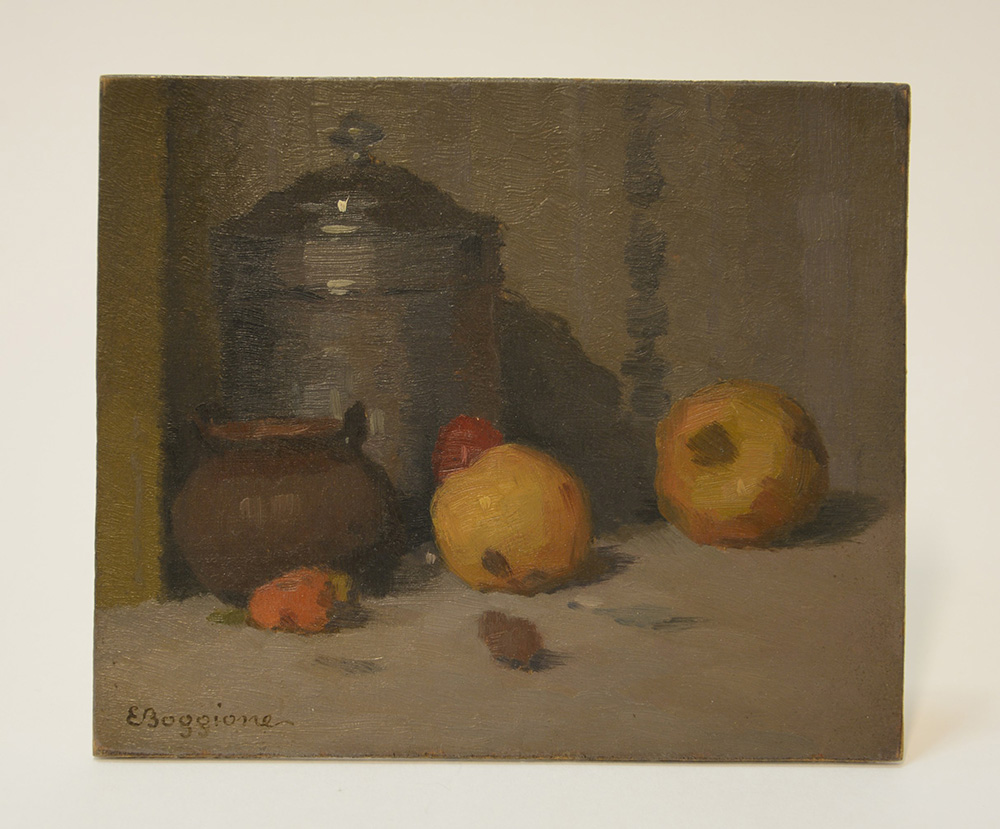 Enrico Boggione (Torino 1889 - 1985)"Composizione con frutta e vasi" olio su...