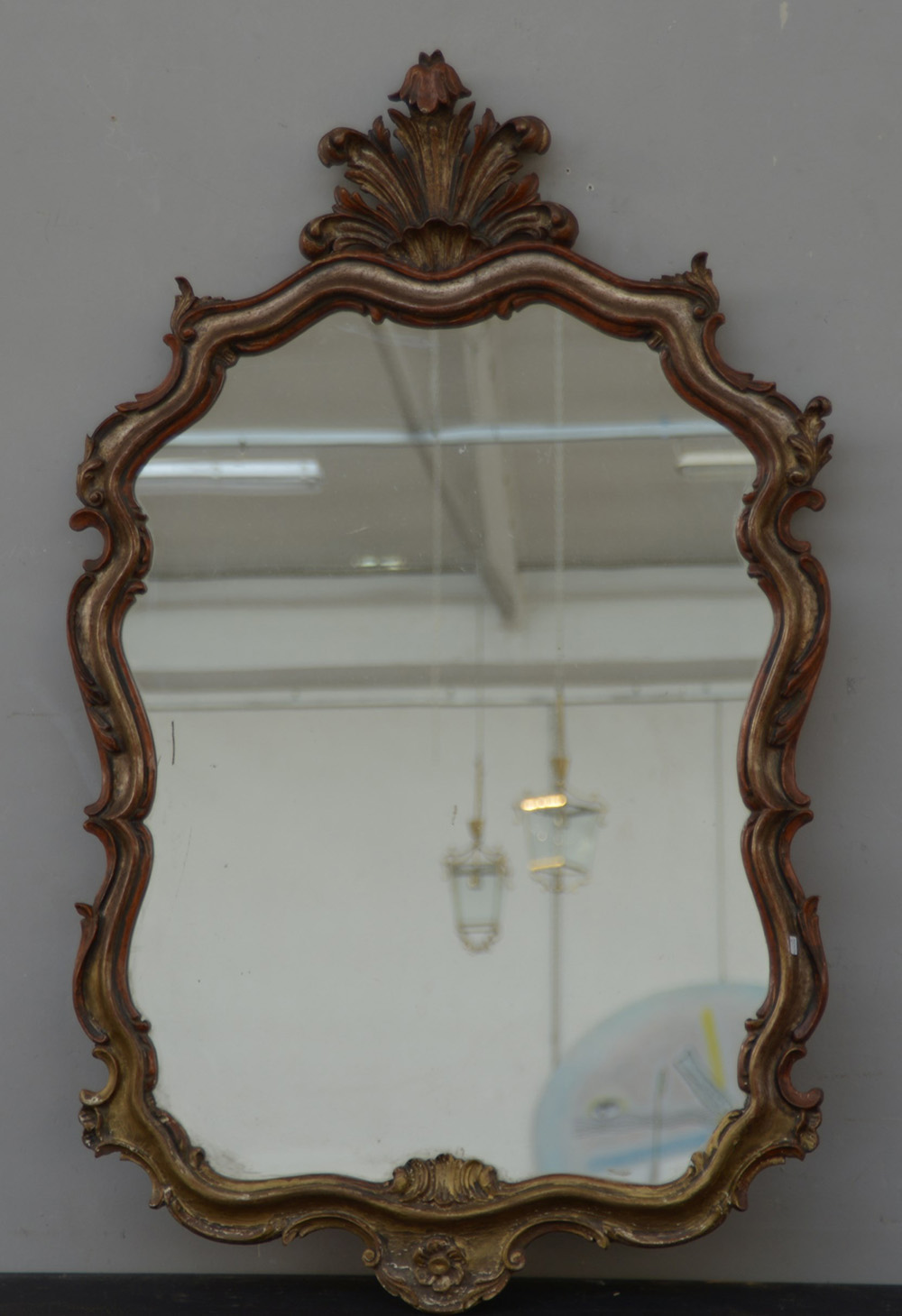 Specchiera con cornice sagomata intagliata e argentata a volute fogliate (cm 120x76) (difetti e mancanze)