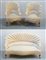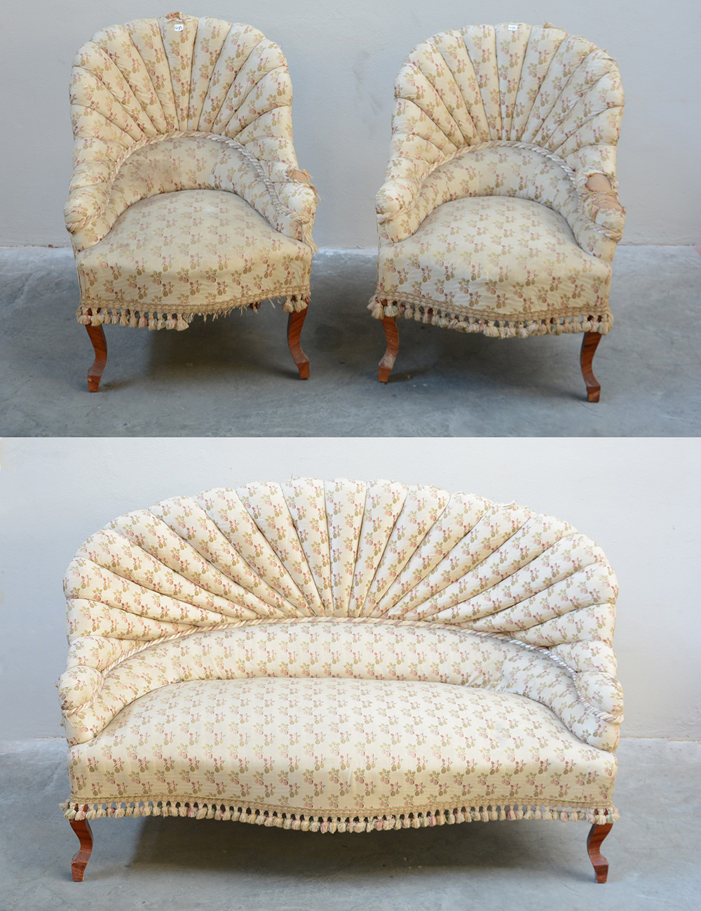 Fornitura da salotto composta sa divano e due poltrone imbottiti con schienale a ventaglio, piedi sagomati e lastronati. Fine secolo XIX (difetti)