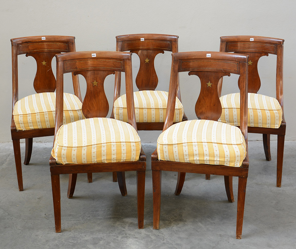 Gruppo di cinque sedie a gondola in noce con schienale intarsiato in ottone a motivo di stella, gambe a sciabola, rivestite in tessuto a righe. Fine secolo XIX (difetti)